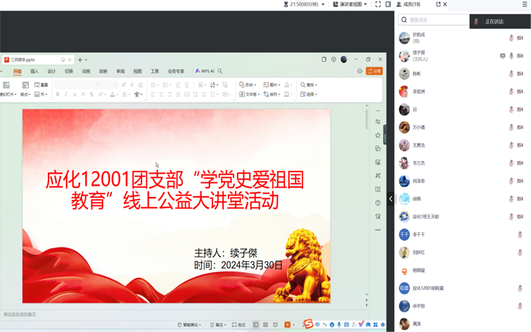 (通讯员 龙怡 聂琳珊)为深入学习贯彻《党史学习教育工作条例》《中华人民共和国爱国主义教育法》和纪念新中国成立75周年,引导同学们听党话跟党走。化工学院于3月26日至4月20日组织各年级同学通过线上线下相结合的方式观看“学党史爱祖国教育”线上公益大讲堂活动,积极学习并开展研讨。