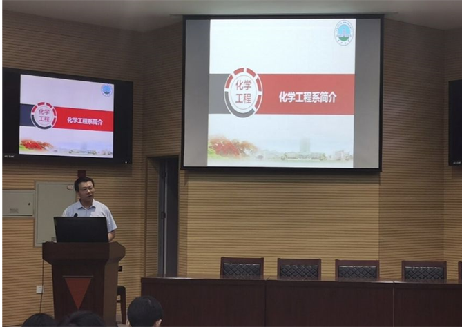 化工系主任田明磊老师紧紧围绕专业发展向同学们介绍了化学工程与工艺专业的发展前景和开设课程等基本信息,介绍了本专业所拥有的实验仪器、六个专业实验室有关情况,表示为同学们提供了优越的学习与科研条件。王齐老师介绍了专业相关的各种竞赛,并对往年的参赛情况及作品进行了展示。