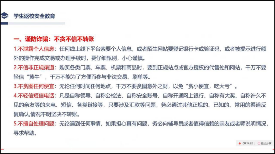 在安全教育方面,各班班主任从防电信诈骗、防溺水、防车祸、防借贷陷阱、防意外伤害五方面进行引导,强调个人反诈骗意识的重要性。切实提升学生对电信新型诈骗的防范意识和警惕性,增强学生的安全意识。