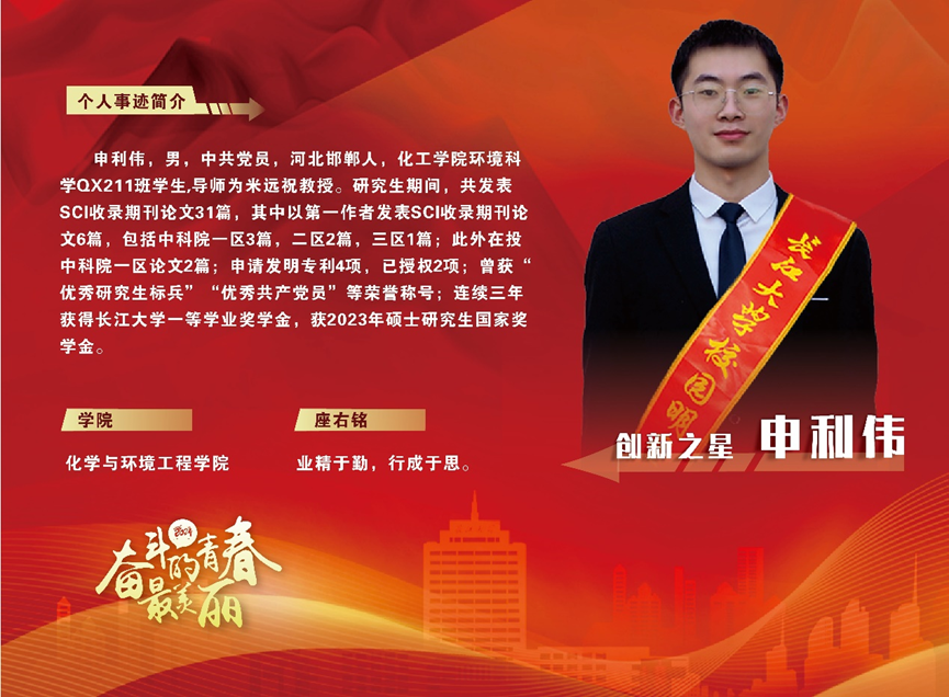 进入大学以来,申利伟始终把专业学习放在首位,他知道,只有牢固的专业知识才是今后工作的根本。在本科期间必修平均绩点4.09,名列专业第一,多次获得国家励志奖学金、三好学生等荣誉称号。在学习书本知识的同时,他还积极加入学院老师实验室,在导师和学长的帮助下开展大创项目,并获得了湖北省大学生化学化工学术报告会二等奖。大四时以专业第一保研至本校继续攻读硕士研究生,目前顺利通过了四六级考试,并连续三年获得了williamhill英国一等学业奖学金,获2023年硕士研究生国家奖学金,荣获“优秀研究生标兵”、“优秀共产党员”等称号。