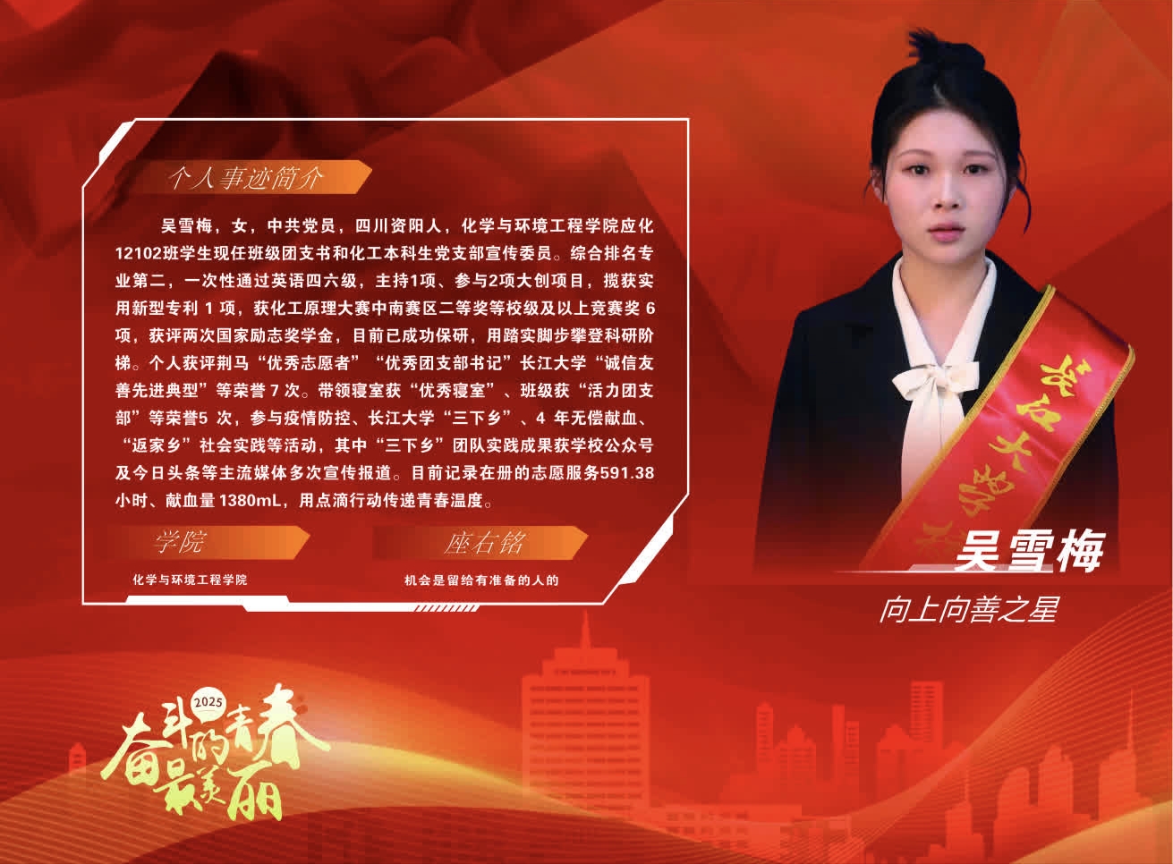 齐心协力,点燃集体星火。担任团支书三年,她始终积极参与班级建设所在班级先后5次荣获标兵班集体”、"活力团支部”等荣誉称号,期间培养发展2名共青团员。个人因表现突出,2次获评优秀团支书”,并荣获优秀共青团干部”“优秀学生干部”等称号。作为学院2022级朋辈导师,她以传帮带”的方式悉心指导新生适应大学生活,用实际行动发挥了学生骨干的示范引领作用。