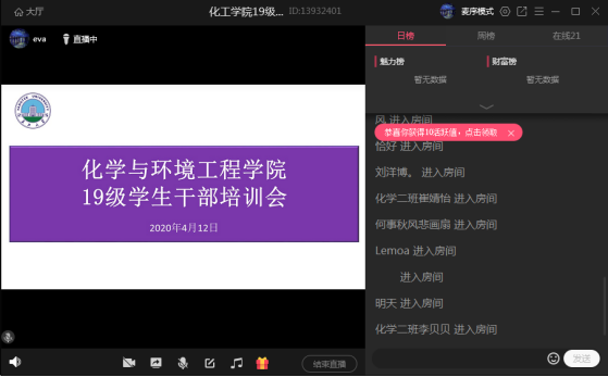 (通讯员:刘慧)疫情期间,为应对线上学习新模式,促进学院学风建设,提升学生干部工作能力,4月12日12时,化工学院线上召开了19级学生干部培训会。参加本次会议的有18级优秀干部徐珊珊,吴丹妮以及19级全体学生干部,会议由辅导员王娜老师主持。