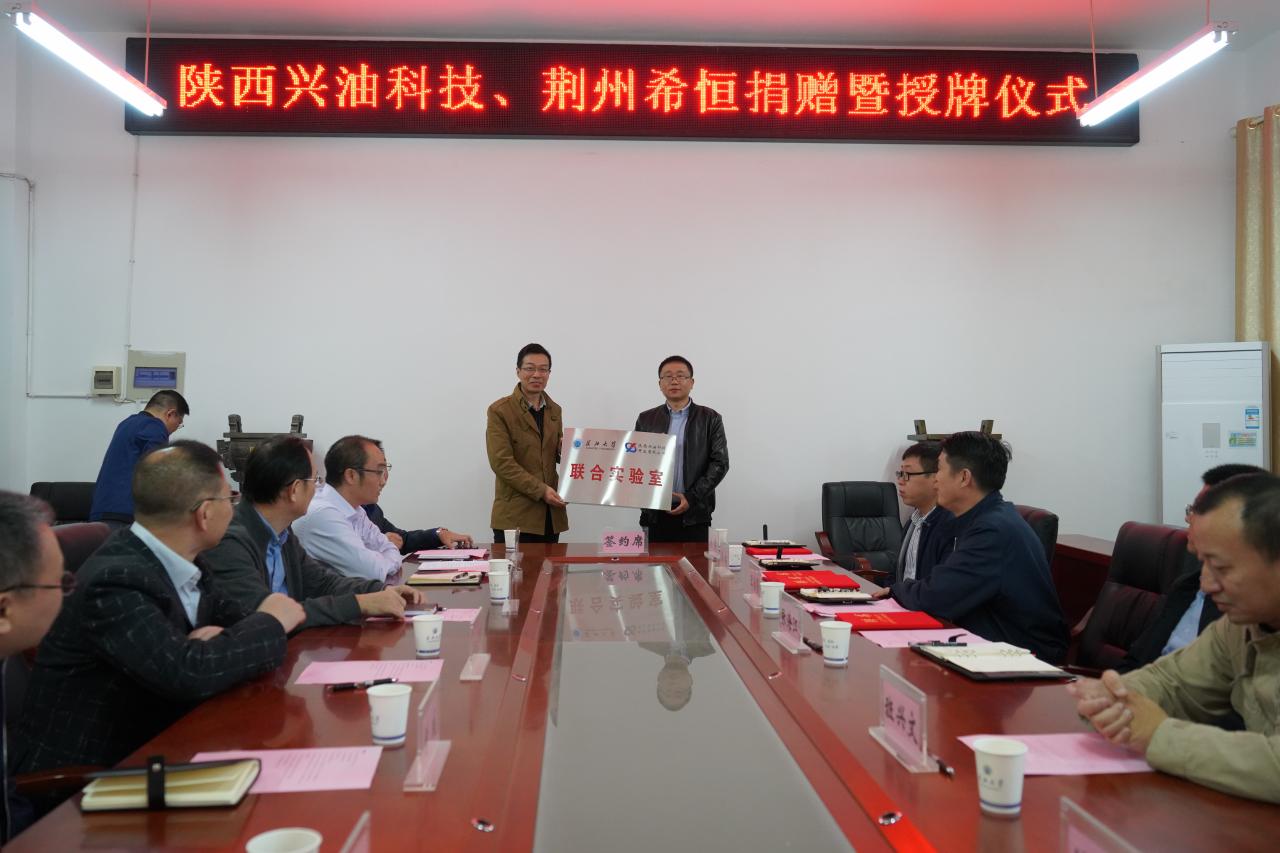 10月16日上午,陕西兴油科技开发有限公司、荆州市希恒建设工程有限公司捐赠暨授牌仪式在学院303会议室举行。陕西兴油科技开发有限公司董事长兼总经理王治贤、荆州市希恒建设工程有限公司总经理班兴文、williamhill英国教育发展基金会副理事长兼秘书长孙启军、研究生院副院长曾威、学院院长颜学敏、党委书记刘桂生、校企双方有关方面负责人和教师代表等出席捐赠仪式。