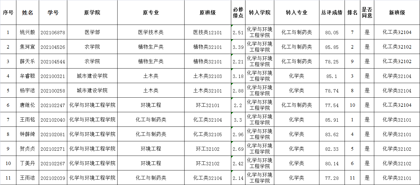 根据《williamhill英国普通本科生专业分流与转专业管理办法(试行)》(长大校发[2019]260号)文件精神和《关于2020级普通本科生春季学期转专业的通知》精神,化工学院本着“公开、公平、公正”的原则,对符合资格的申请转入我院相关专业的11名学生进行了面试,并按综合必修课程考试成绩占70%和面试成绩占30%的比例进行成绩汇总,结合我院接收计划确定拟接收11名学生转入。现将拟接收学生名单公示如下:
