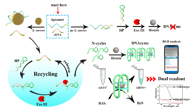 金黄色葡萄球菌(S. aureus)是常见存在于食物、水、土壤和环境中的致病菌之一,可通过污染食物或水源引发食源性疾病,也可通过汗腺、皮肤黏膜或伤口入侵机体产生毒素,引发化脓、急性肺炎、骨髓炎、败血症等疾病,严重者甚至危及生命。由于其对人体健康和公共卫生安全的巨大威胁,S. aureus的检测是必要的。常规的细菌培养计数检测方法具有简便、稳定、灵敏的优点,但局限于分析时间长,有时甚至需要几天来完成。为了克服上述缺点,酶联免疫吸附法(ELISA)、聚合酶链反应(PCR)和下一代基因测序(NGS)等替代检测方法应运而生。然而,ELISA由于抗体成本较高且易受污染而限制了其应用。尽管PCR和NGS实现了病原体特异性核酸检测,但仪器昂贵,操作繁琐。由于需要对实际样品进行核酸的提取,无法实现无损的病原体分析,不适用于现场检测。因此,寻找一种快速、灵敏、经济有效的方法对复杂样品中的S. aureus进行现场检测具有重要意义。
