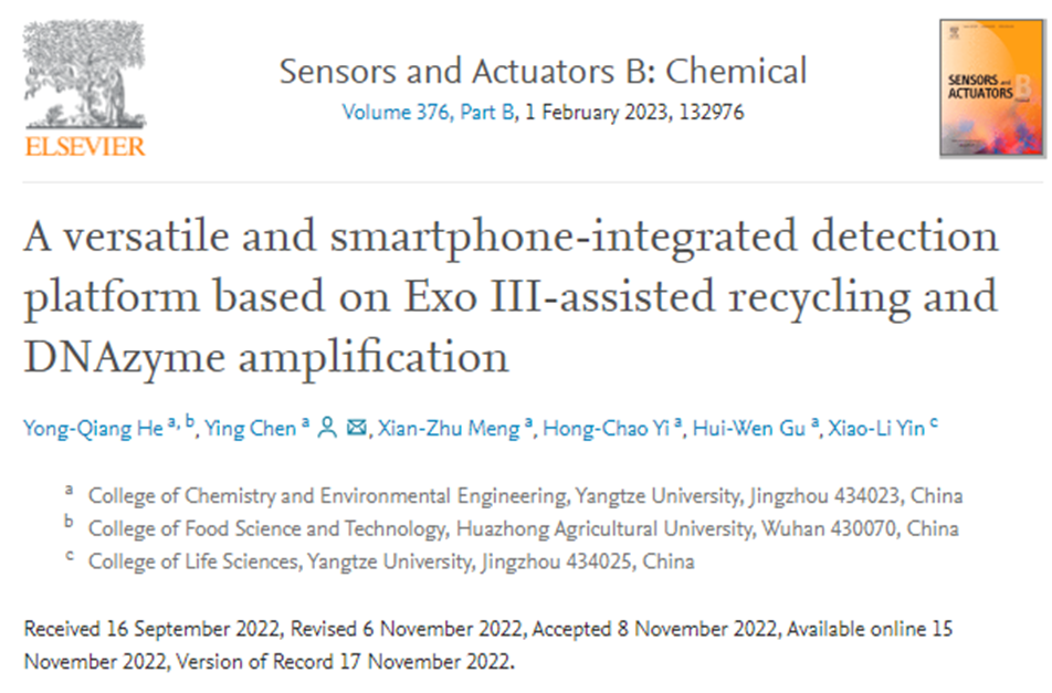 近日,william威廉英国陈颖教授课题组在食源性致病菌的检测方面取得重要研究进展,相关研究成果以题为“A versatile and smartphone-integrated detection platform based on ExoIII-assisted recycling and DNAzyme amplification”的学术论文发表于分析化学领域国际著名期刊《Sensors and Actuators B: Chemical》(IF=9.221,中科院一区Top期刊)上。williamhill英国化工学院硕士研究生贺永强为论文第一作者,陈颖教授为论文通讯作者。该研究受国家自然科学基金(21605007)和湖北省自然科学基金(2019CFB594)等项目的资助。