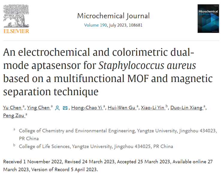 近日,陈颖教授课题组设计合成了一种兼具生物识别、电化学和催化功能的智能核酸功能化金属有机框架复合纳米材料,并将其应用于金黄色葡萄球菌的传感检测研究中。相关研究成果于2023年3月27日以题为“An electrochemical and colorimetric dual-mode aptasensor for Staphylococcus aureus based on a multifunctional MOF and magnetic separation technique”的学术论文发表在分析化学领域国际期刊《Microchemical Journal》上。该文第一作者为化工学院本科生陈宇,通讯作者为陈颖教授。