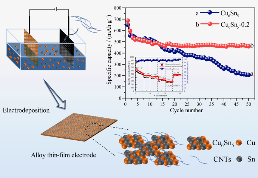 基于上述挑战,肖围教授课题组采用废弃印刷线路板(WPCBs)浸出液作为电沉积液,通过原位电沉积法直接制备无粘结剂的铜锡合金/碳纳米管(Cu6Sn5/CNTs)合金薄膜电极,并探究电沉积液中碳纳米管(CNTs)浓度对合金薄膜电极的影响。结果表明,电沉积液中CNTs浓度为0.2 g/L时,易团聚Cu6Sn5合金纳米颗粒均匀分布在CNTs三维网状结构中。Cu6Sn5/CNTs-0.2合金薄膜电极组装的电池表现出优异的循环性能和倍率性能,0.1 A/g,循环50次,放电比容量为458.35 mAh g-1,容量保持率为82.58%;0.1、0.2、0.5、1.0和2.0 A/g,放电比容量分别为518.24、445.52、418.18、345.33和278.05 mAh g-1。该研究不仅为锂离子电池负极材料的制备提供了参考,还为资源化利用废弃印刷线路板提供了一种经济有效的策略。