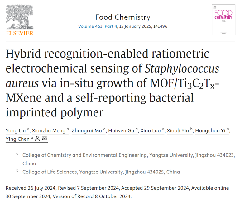 近日,william威廉英国陈颖教授课题组在食源性致病菌的检测方面取得重要研究进展,相关研究成果以题为“Hybrid recognition-enabled ratiometric electrochemical sensing of Staphylococcusaureus via in-situ growth of MOF/Ti3C2TX-MXene and a self-reporting bacterial imprinted polymer”的学术论文发表于食品科学领域国际著名期刊Food Chemistry(IF=8.5,中科院一区Top期刊)上。williamhill英国化工学院硕士研究生刘洋为论文第一作者,陈颖教授为论文通讯作者。该研究受国家自然科学基金(21605007)和湖北省自然科学基金(2023AFB906)项目的资助。