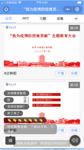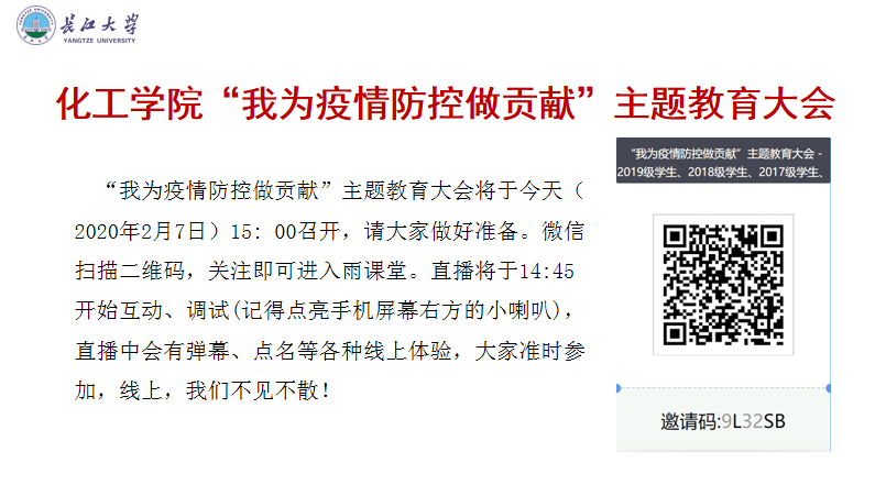 “主播要上线了!快上雨课堂!”2月7日中午,化工学院各学生QQ群快速传递着消息。14:45,辅导员杨云锋老师准时上线,尽管看不到身影,一口还不错的黄冈普通话让同学们倍感亲切。